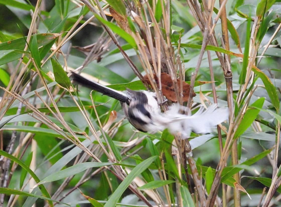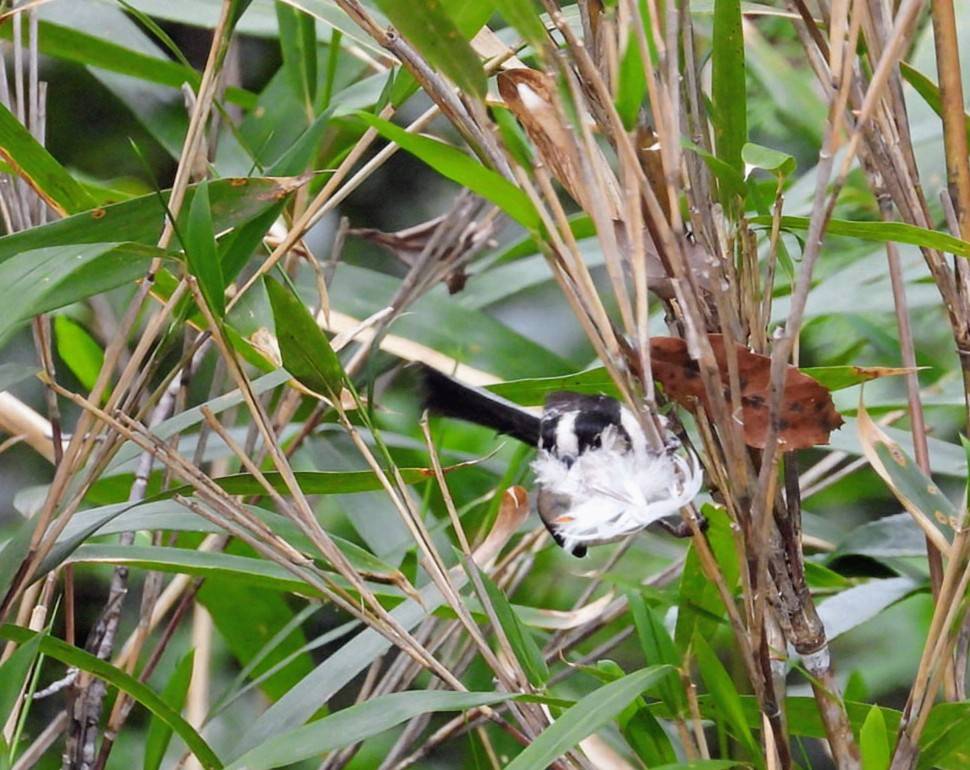 生物紹介 2026年04月17日 Post Share エナガ夫婦の巣材運び こちらも公園ユーザーのOさんから頂きました。 公園の里山で、エナガが大きな鳥の羽を運ぼうとしています。自分の体ほどある白い大きな羽で、よほど気に入ったのか何度落としても拾いに行きます。羽毛はエナガの巣の内装に用いるため、おそらく巣作り中の夫婦と思われます。 エナガは雛の巣立ちのシーズンを迎えているので、かなり遅い巣作りですが、今度こそうまくいくと良いですね。 ※クリックで拡大します。 スタッフ日記一覧に戻る 関連記事 生物紹介 2023.02.27 調整池の忍者 生物紹介 2023.04.27 ヒバリの写真を頂きました!! 生物紹介 2023.11.13 ハイタカ現る