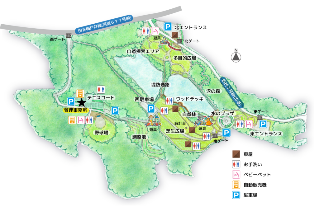 野球やテニスを楽しめるスポ―ツ施設、水のプラザや自然散策エリア、芝生広場や遊具など家族で楽しめるアスレチック施設など