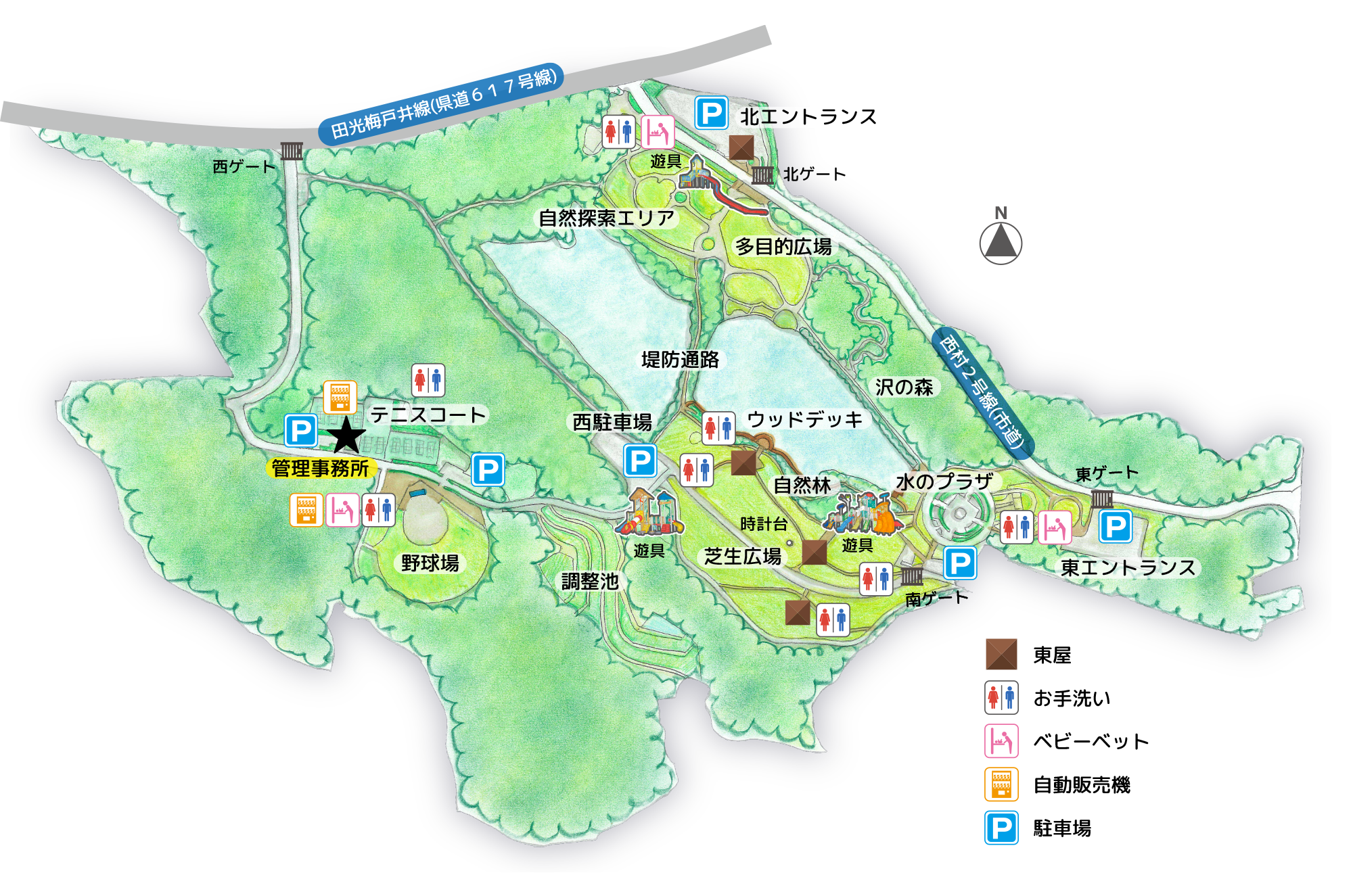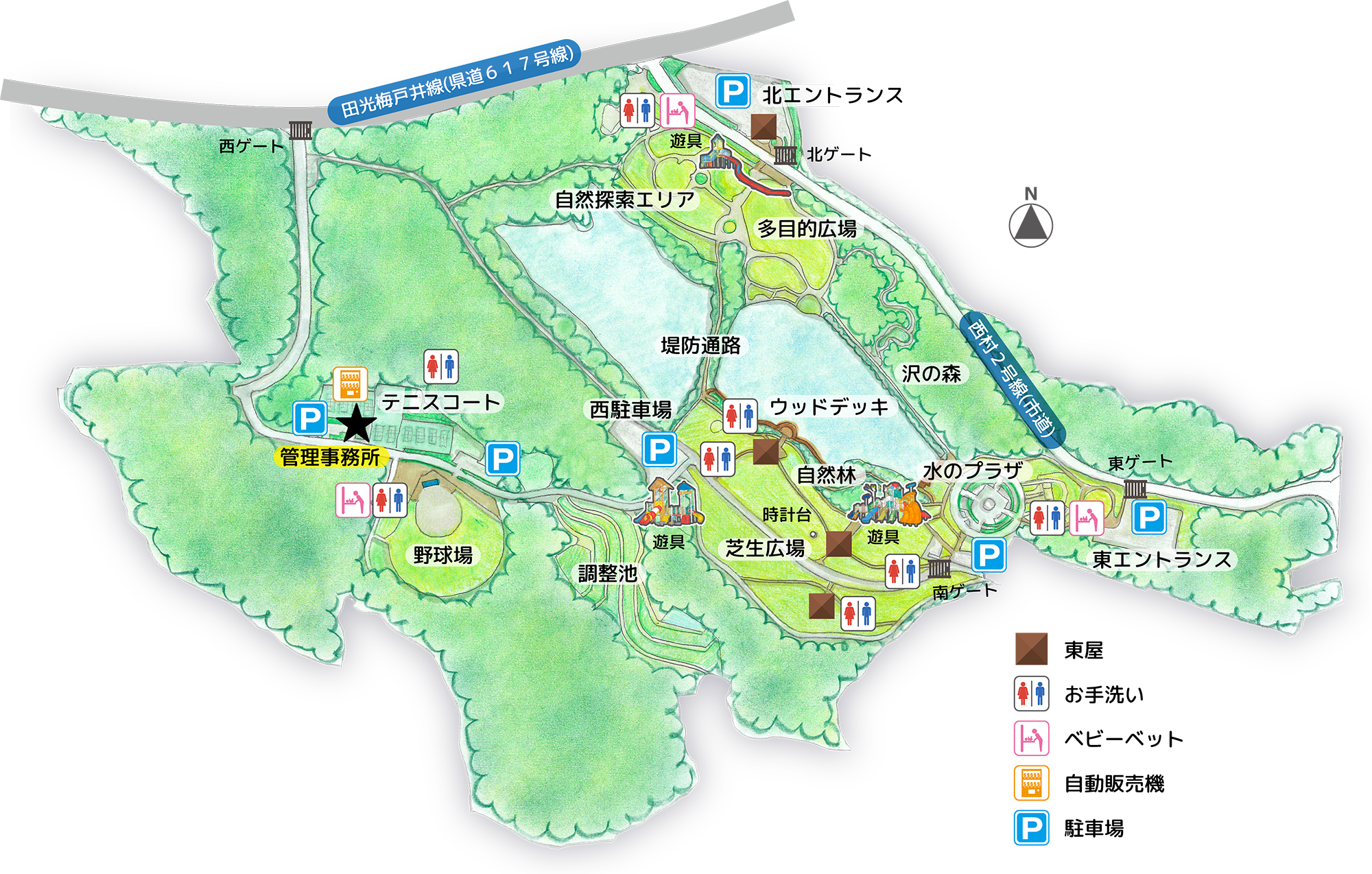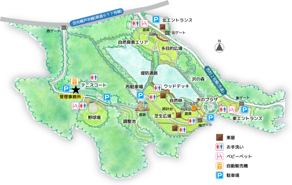 野球やテニスを楽しめるスポ―ツ施設、水のプラザや自然散策エリア、芝生広場や遊具など家族で楽しめるアスレチック施設など