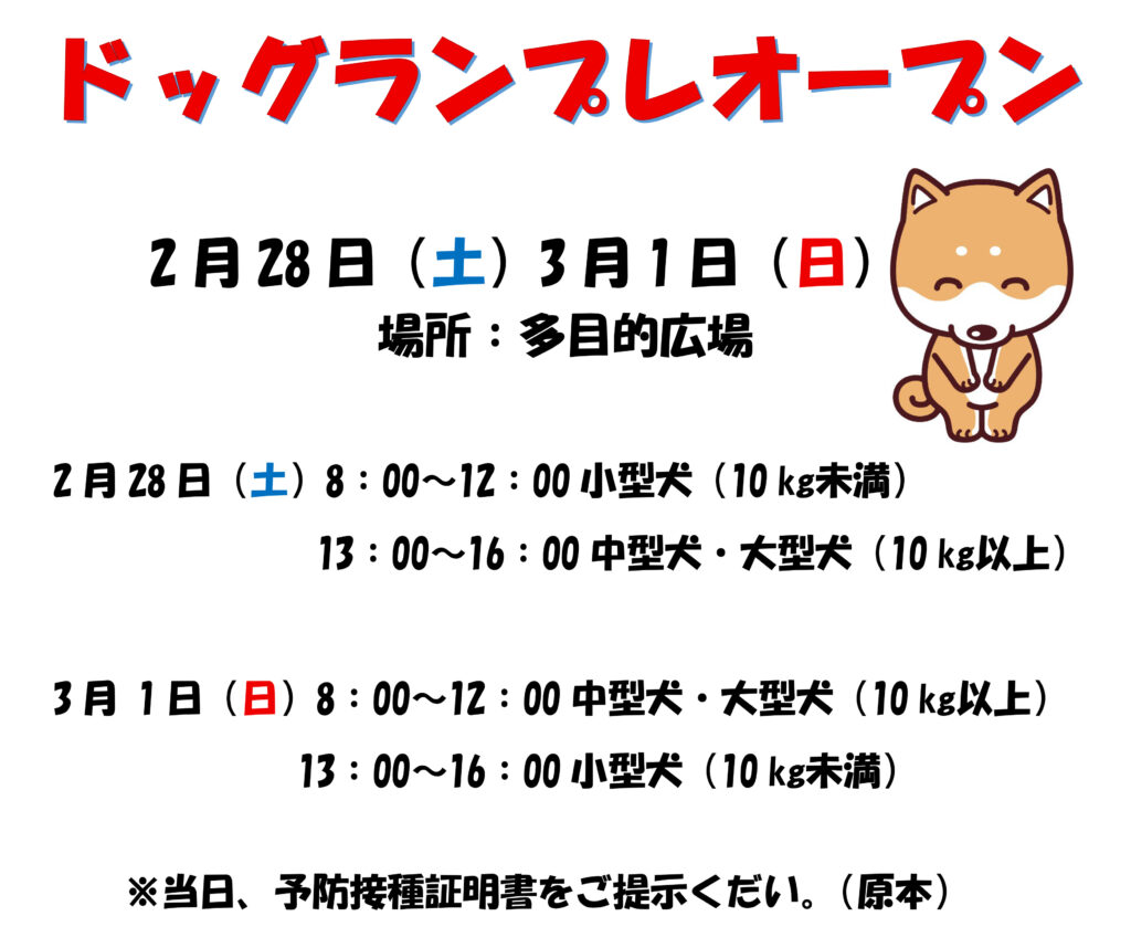 | 時間 | ※ワンちゃんの大きさによってご利用時間が変わりますのでご注意ください。 2月28日(土) 8:00~12:00小型犬(10㎏未満) 13:00~16:00中型犬・大型犬(10㎏以上) 3月 1日(日) 8:00~12:00中型犬・大型犬(10㎏以上) 13:00~16:00小型犬(10㎏未満) |