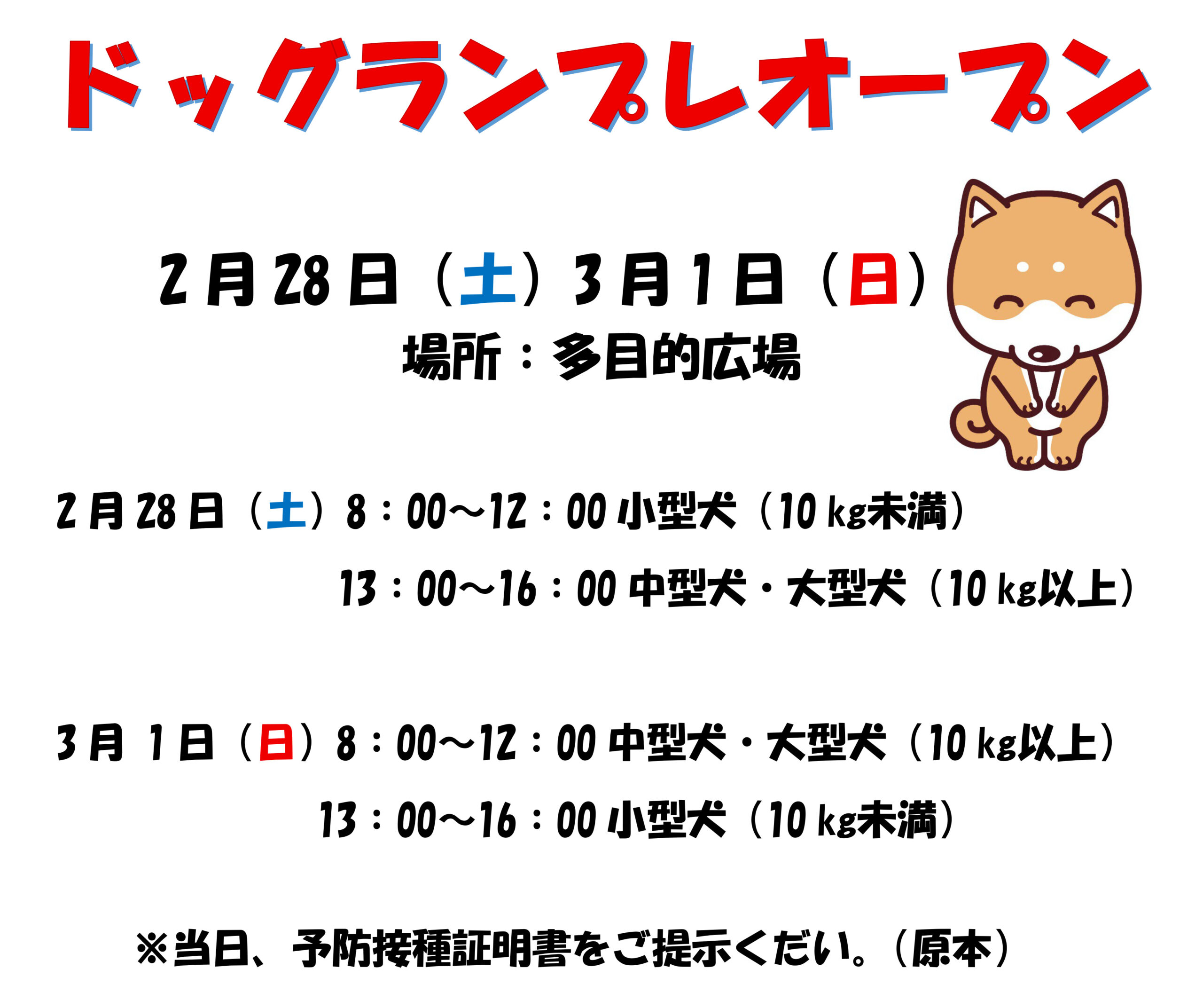 | 時間 | ※ワンちゃんの大きさによってご利用時間が変わりますのでご注意ください。 2月28日(土) 8:00~12:00小型犬(10㎏未満) 13:00~16:00中型犬・大型犬(10㎏以上) 3月 1日(日) 8:00~12:00中型犬・大型犬(10㎏以上) 13:00~16:00小型犬(10㎏未満) |