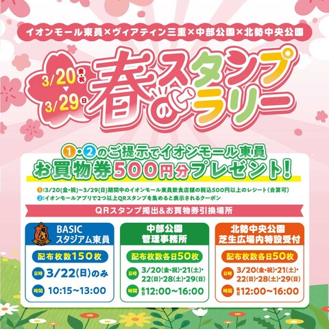 この度、イオンモール東員・ヴィアティン三重・中部公園とのコラボ企画として、「春のスタンプラリー」 に参画いたします!