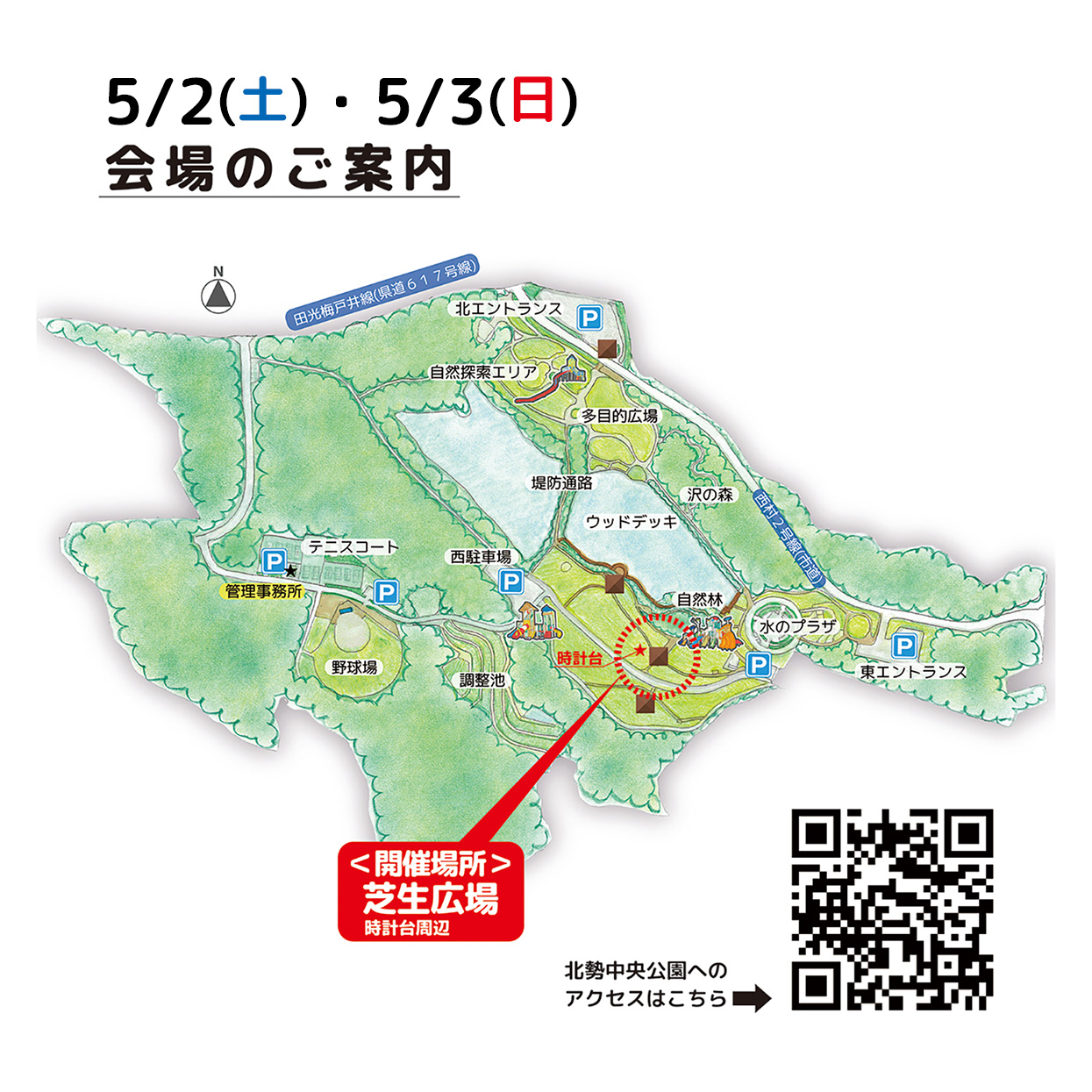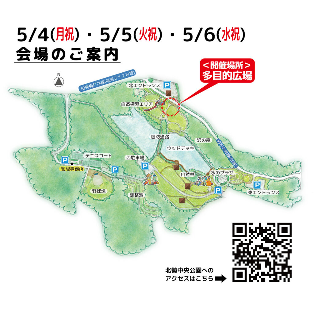 | 場所 | ●芝生広場 :5月2日(土)・5月3日(日) ●多目的広場:5月4日(月祝)・5月5日(火祝)・5月6日(水祝) ※日によって場所が変わります |