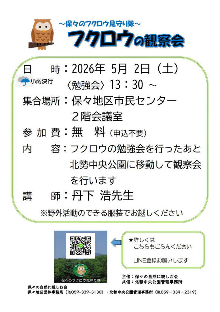 そこで、丹下浩先生を講師に迎え、保々地区市民センターにてフクロウの勉強会を行った後、北勢中央公園に移動して観察会を行います。